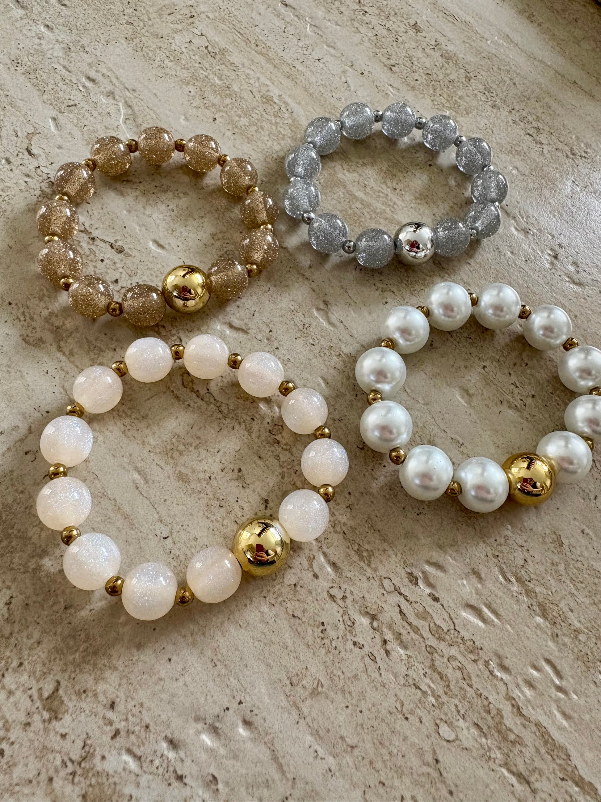 - Pailleté doré, argenté, blanc vanille (perles en acrylique)